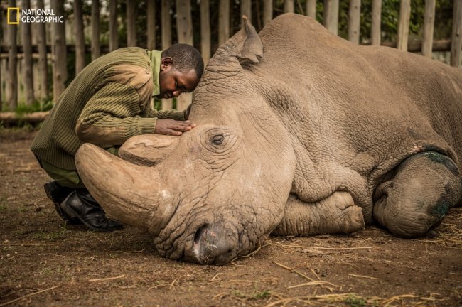 最后一头雄性北方白犀牛苏丹于2018年去世。图为奥佩杰塔保护区的饲养员约瑟夫·瓦奇拉在向它告别。图片来源:Ami Vitale / National Geographic