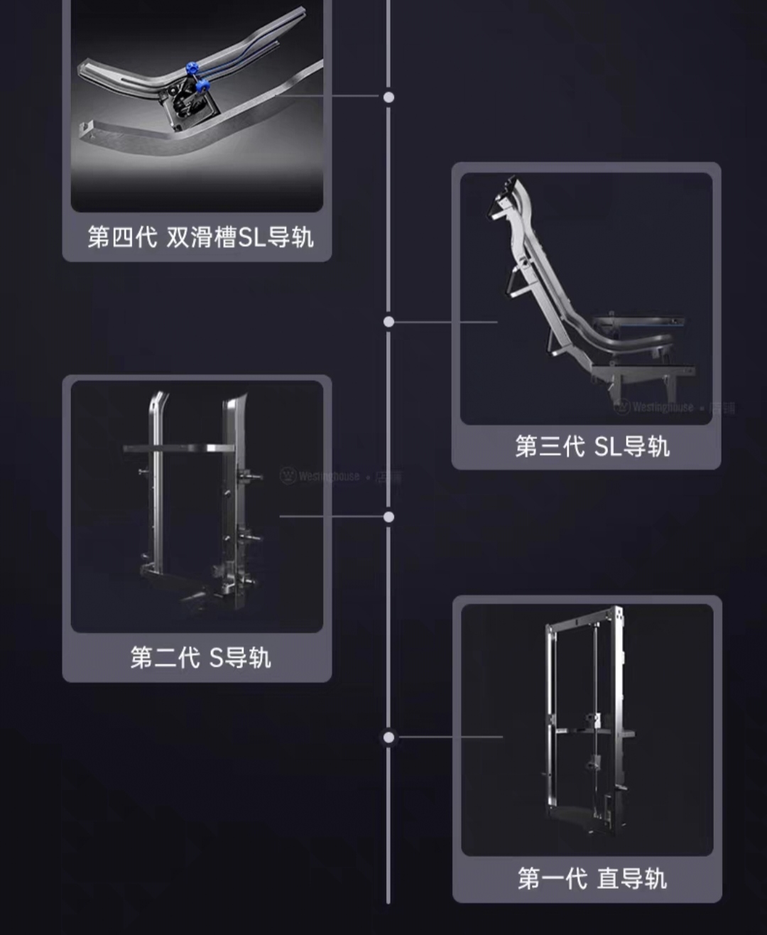 市面上主要的导轨分为直线型,S型,SL型导轨。个别厂商还推出了新概念——双滑槽SL导轨,其实和SL型导轨没有大多区别,反而成了掩饰机芯不足和营销的噱头。据我了解,有些有些品牌如西屋,设计成双滑槽导轨实际是因为他们采用的3D机芯不能很好贴合人体肩颈曲线。因此才退而求其次选用双滑槽,用高低两个滑槽进行肩位调节,并不能做到如4D机芯般精准探出和贴合。